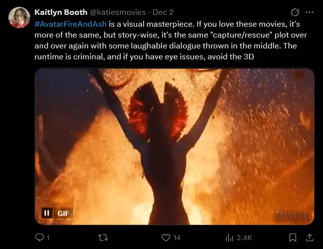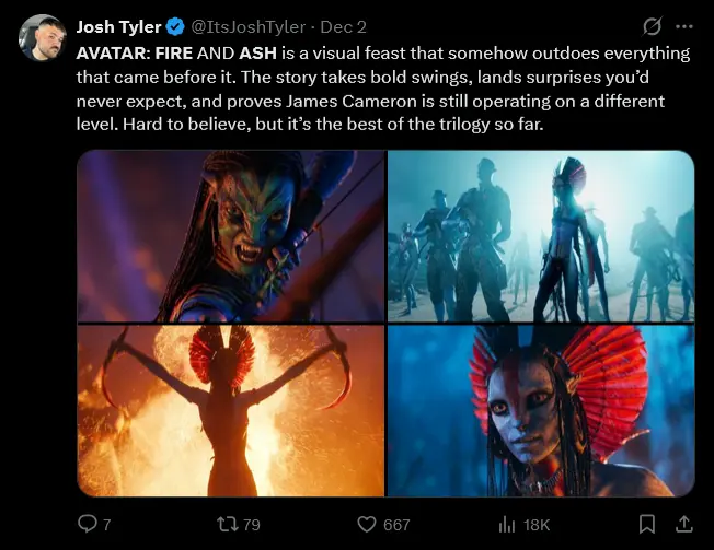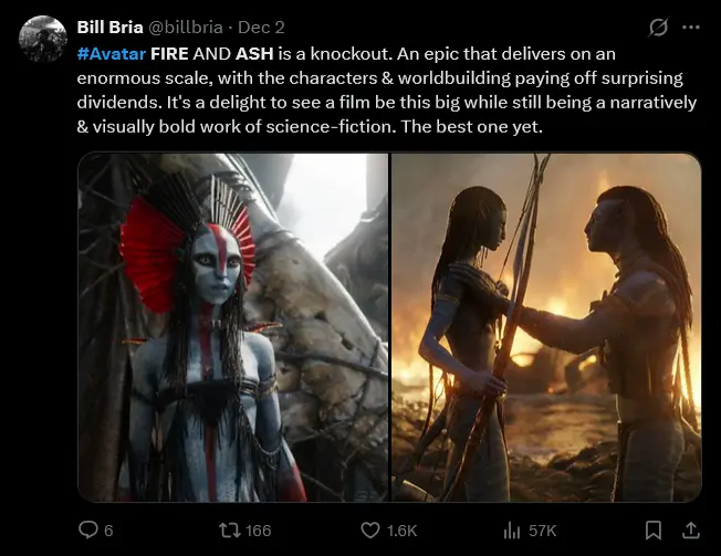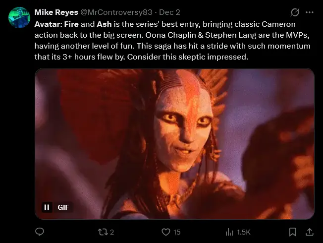 Another reviewer summed it up simply: “Avatar: Fire and Ash is the series’ best entry, bringing classic Cameron action back to the big screen. Oona Chaplin & Stephen Lang are the MVPs, having another level of fun. This saga has hit a stride with such momentum that its 3+ hours flew by. Consider this skeptic impressed.”