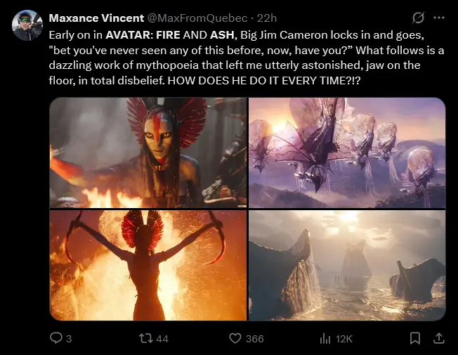 One reviewer exclaimed, “Early on in AVATAR: FIRE AND ASH, Big Jim Cameron locks in and goes, ‘bet you’ve never seen any of this before, now, have you?’ What follows is a dazzling work of mythopoeia that left me utterly astonished, jaw on the floor, in total disbelief. HOW DOES HE DO IT EVERY TIME?!?”