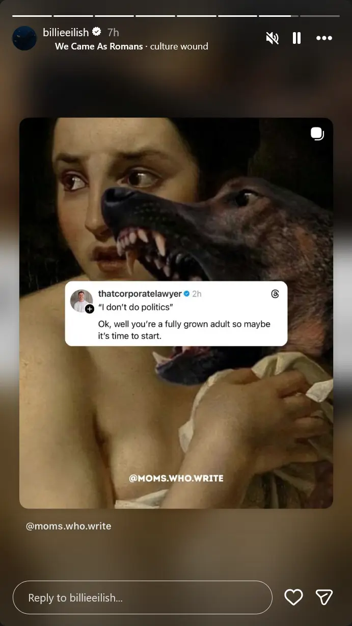 Soon after Pretti’s death, Billie turned to Instagram. According to her Instagram Story posts, she shared a video honoring Pretti and calling him a real American hero. She also reposted a message criticizing people who avoid political discussions. The post read, “I don’t do politics” Ok, well you’re a fully grown adult so maybe it’s time to start.