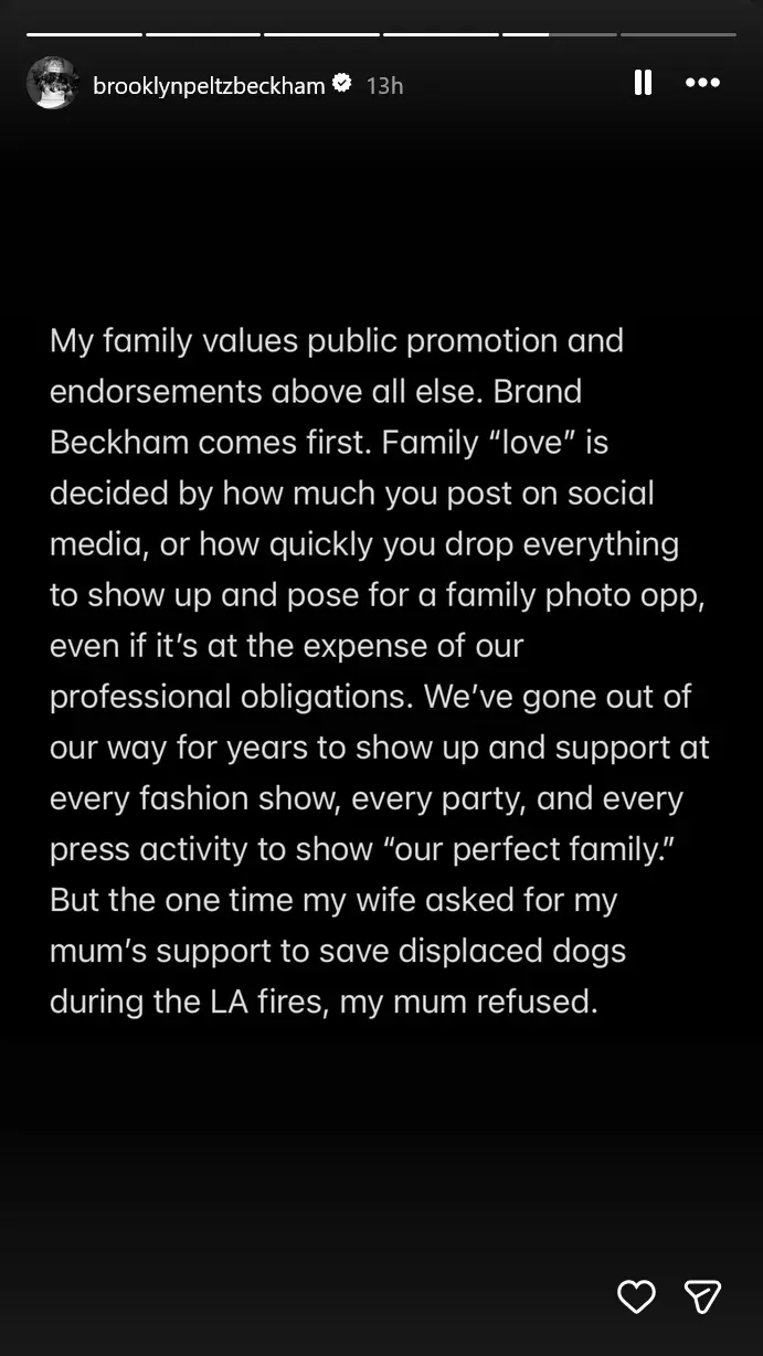 He also took a hard swing at the way his parents present themselves to the world. The Beckhams are known for being a tight-knit brand, but Brooklyn says a lot of that is fake. He accused them of trying to manipulate the press to make themselves look good. He described their public image harshly, saying, “The performative social media posts, family events, and inauthentic relationships have been a fixture of the life I was born into.”
