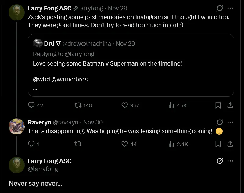 Fong said, “Zack [Snyder is] posting some past memories on Instagram, so I thought I would too. They were good times. Don’t try to read too much into it.” However, when another fan suggested that Snyder might be hinting at a return, Fong replied, “Never say never…” This short response reignited fan hopes that Snyder could come back to DC projects in some capacity.