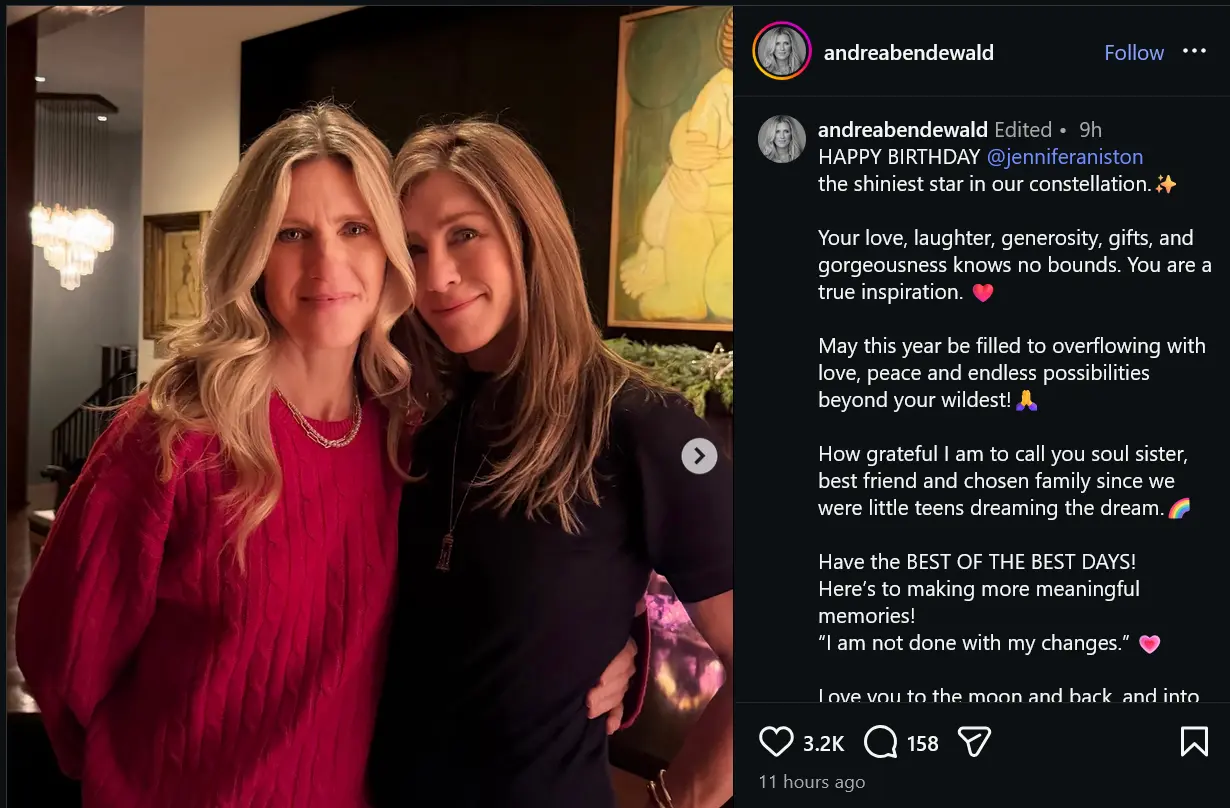 Aniston’s longtime friend Andrea Bendewald also shared birthday wishes, posting a recent photo together as well as a childhood snapshot. She wrote: