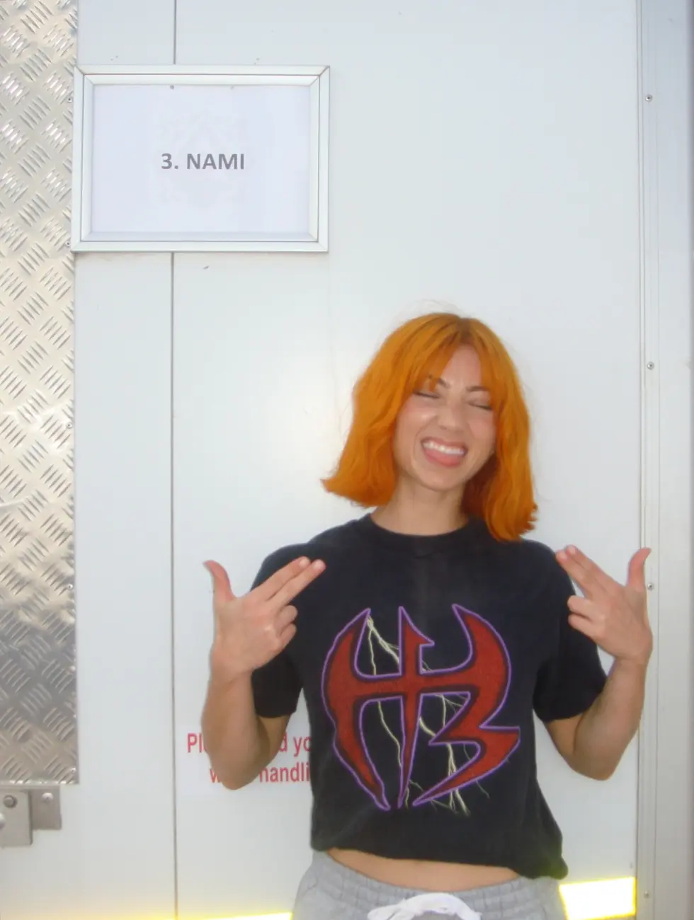 In one photo, Rudd is pictured in a casual trailer, wearing a loose black t-shirt with a bold red and purple graphic. Her bright orange wig is styled in a messy bob with waves and choppy bangs. She sticks her tongue out and flashes hand signs, showing she’s having fun on a busy filming day. A sign on a door behind her reads 3. NAMI, confirming her spot in production.