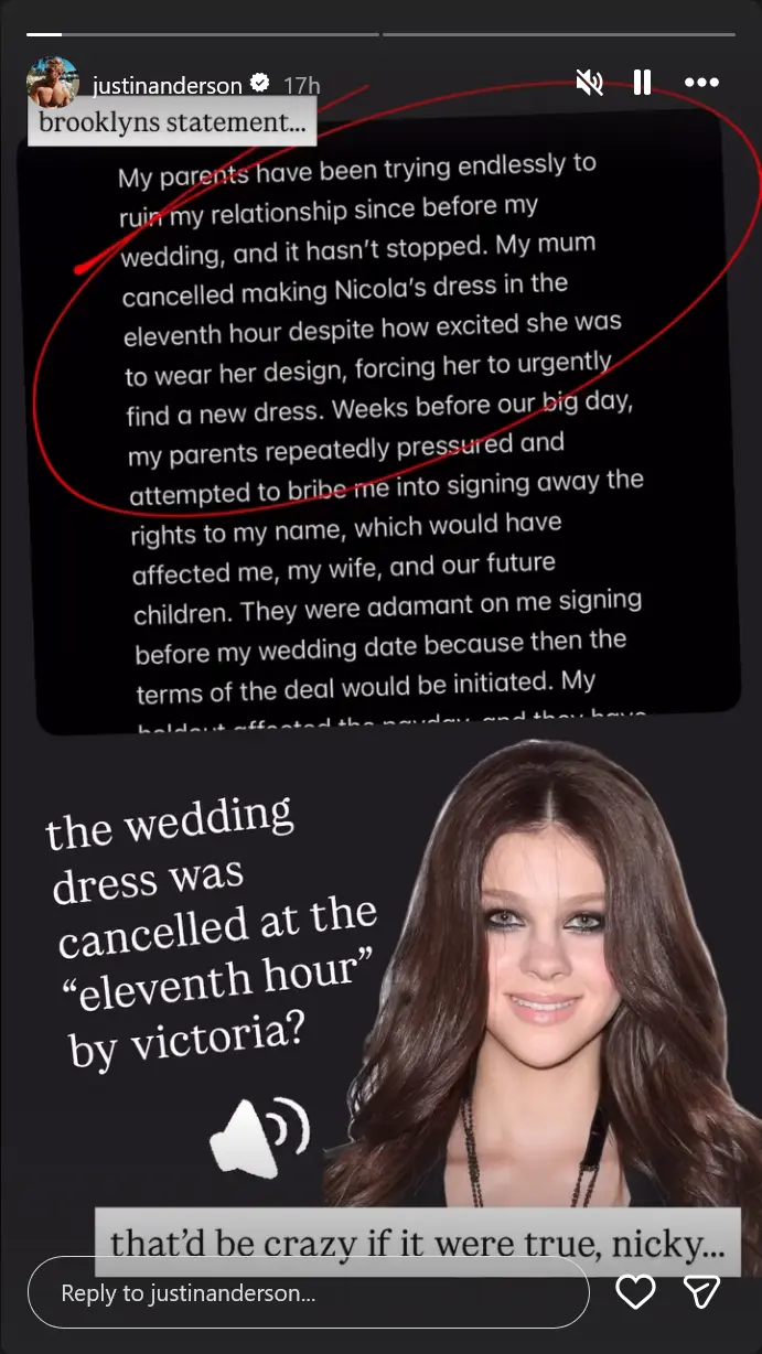 “My parents have been trying endlessly to ruin my relationship since before my wedding and it hasn’t stopped,” he wrote. “My mum cancelled making Nicola’s dress in the eleventh hour despite how excited she was to wear her design, forcing her urgently to find a new dress.” Brooklyn added that Victoria allegedly “hijacked” their first dance, which added tension to the event.