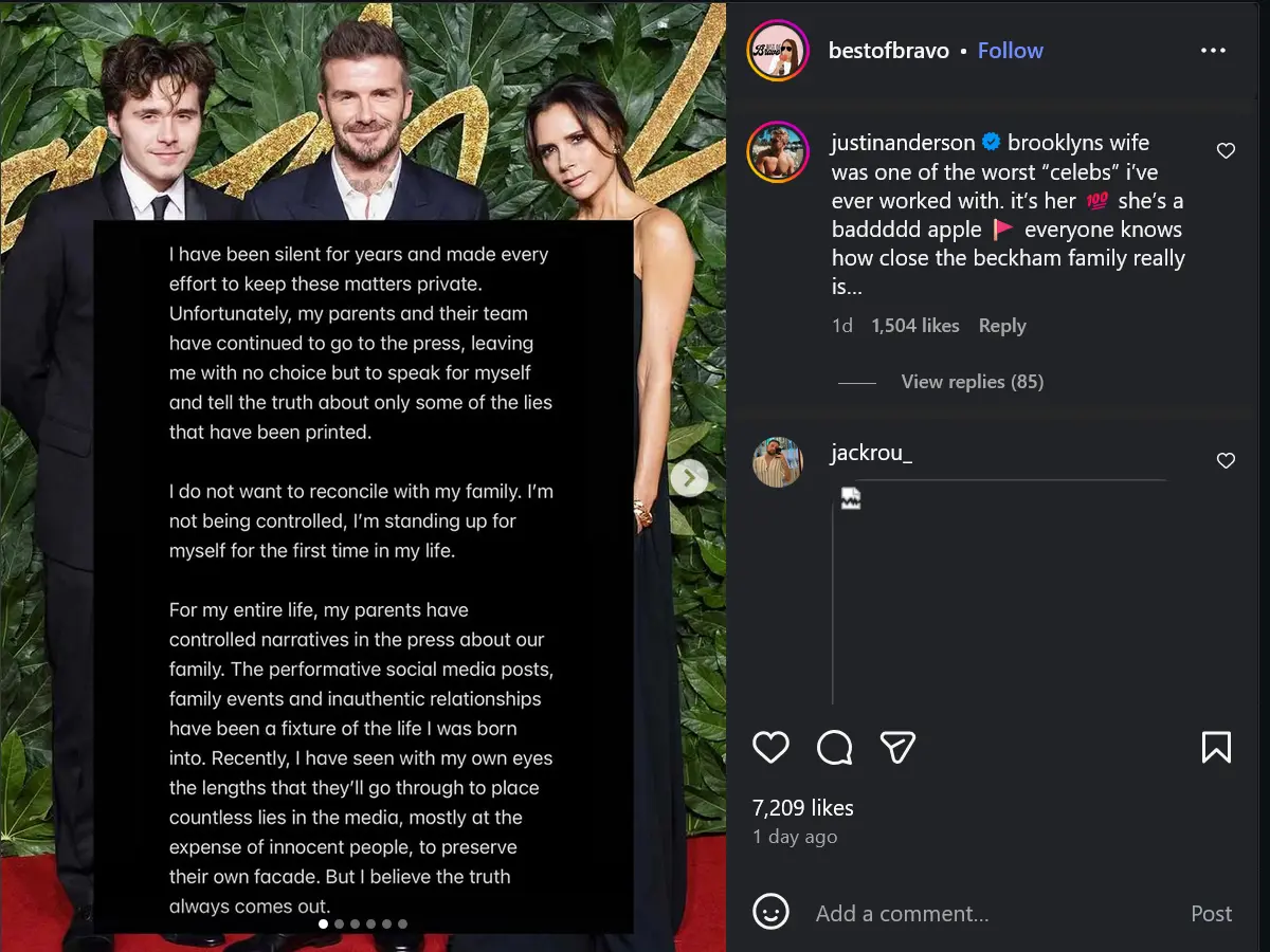 The tension has been visible for years. Brooklyn and Nicola skipped David Beckham’s 50th birthday celebration in May 2025, while his siblings Romeo, Cruz, and Harper attended. Brooklyn’s post makes it clear that the couple is intentionally keeping distance from his parents.