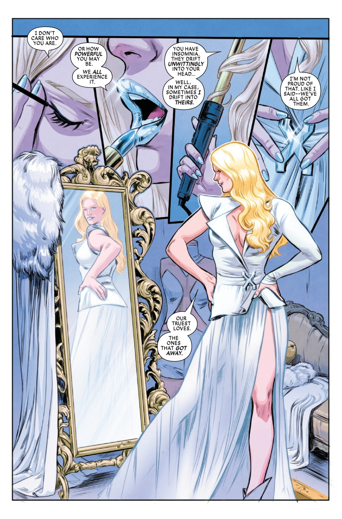 COLLATERAL DAMAGE! With Charles Xavier on the run, EMMA FROST and KITTY PRYDE reckon with their own dreams and fears for the future of mutantkind. AXO feels pushed away from the team and pulled closer and closer to charismatic technologist Sheldon Xenos. But is Xenos who he claims to be? (Spoiler: He is not!)