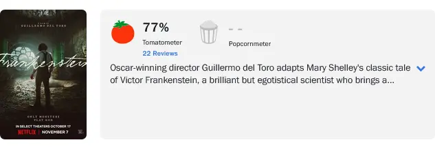 Frankenstein currently holds a 77% critics score on Rotten Tomatoes, based on 22 reviews. While opinions vary, the film clearly reflects del Toro’s artistic vision and commitment to a grand, gothic aesthetic.