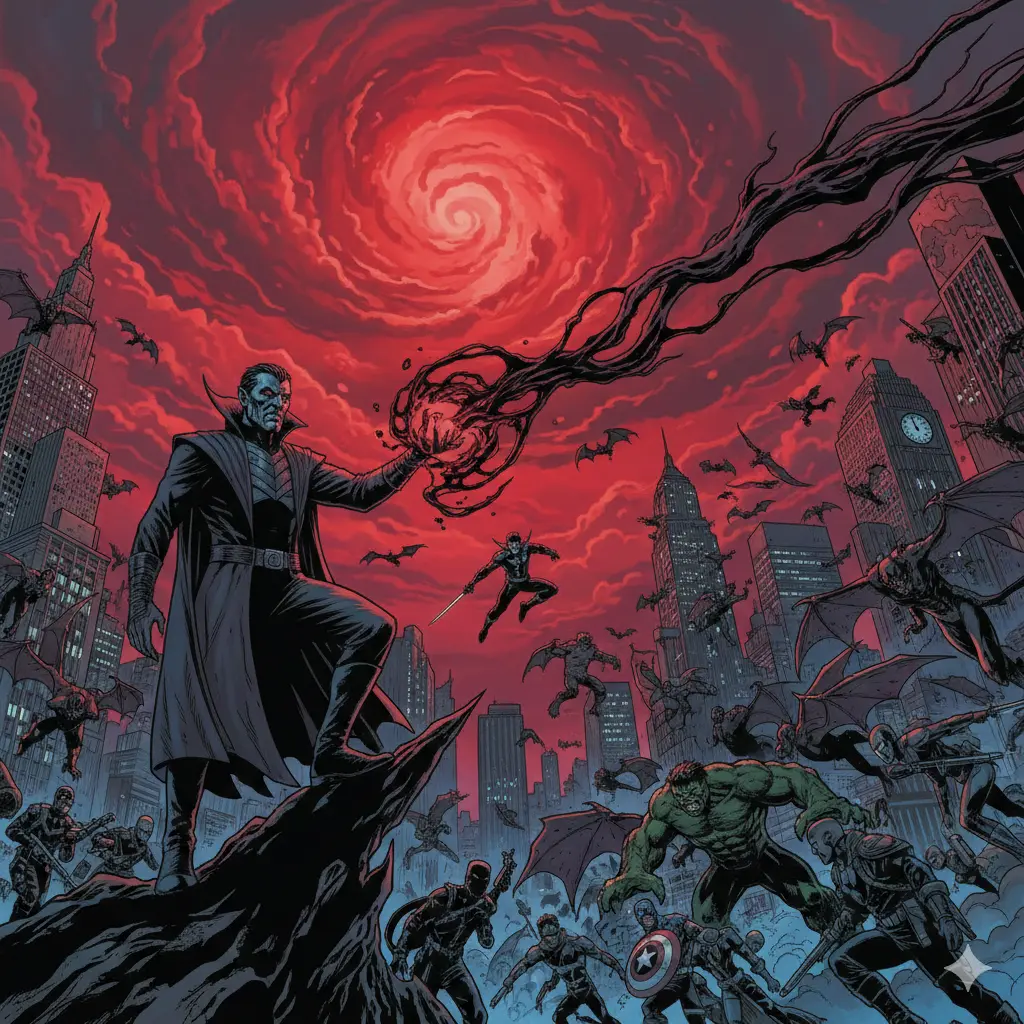 The direct catalyst was the creation of a Blood Trap, a powerful mystical ritual that allowed the vampires to block the sun across the entire globe, plunging the world into perpetual darkness. This eliminated their greatest weakness instantly. The primary offensive began with simultaneous attacks on key global locations, including major hero headquarters and the UN. Key vampire forces, including the Jubilee-led Nightguard (loyal to the Vampire Nation) and the ancient Damascene, were shown to have been activated.