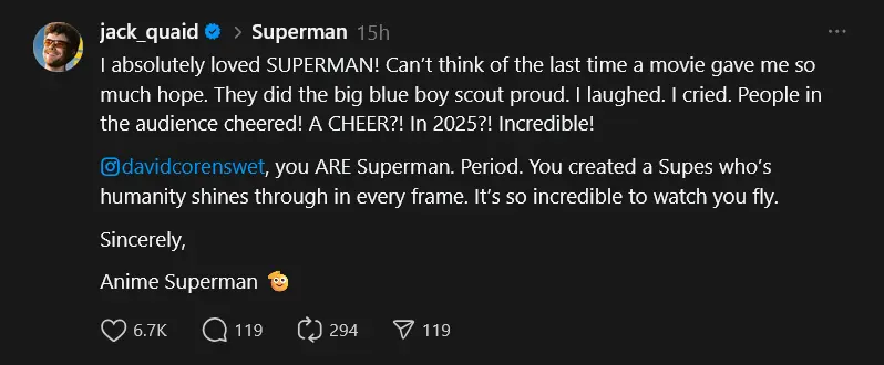Quaid wrote, “I absolutely loved SUPERMAN! Can’t think of the last time a movie gave me so much hope. They did the big blue boy scout proud. I laughed. I cried. People in the audience cheered! A CHEER?! In 2025?! Incredible!” He went on to give Corenswet a big shoutout: “[David Corenswet], you ARE Superman. Period. You created a Supes whose humanity shines through in every frame. It’s so incredible to watch you fly.” Quaid signed off his message with a fun note: “Sincerely, Anime Superman 🫡.”