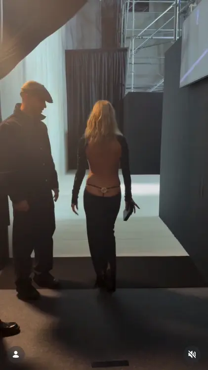 However, the back told a different story, plunging low and revealing a black thong with a sparkling Gucci logo, as captured in front-row footage shared by Vogue.