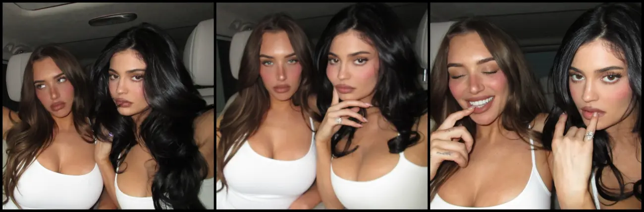 In the photos, both Kylie and Stassie are wearing tight white tank tops that fit their signature minimalist style. They lean into the camera with calm, serious faces, giving off the kind of effortless pose they are known for. Kylie sticks with a soft pout, while Stassie eventually cracks a big smile, changing the mood of the shoot.