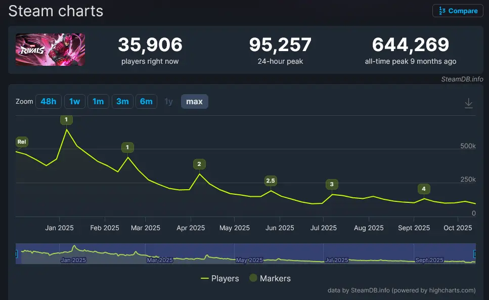Despite its early success, the game has seen a steep decline in players. Forbes and Tracking on Steam show that concurrent players fell from a peak of 644,000 in January 2025 to just 98,000 in less than a year.