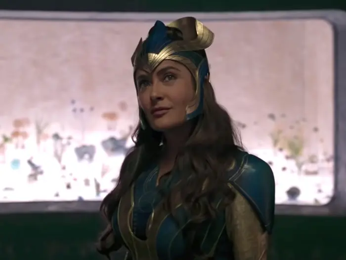 Salma Hayek plays Ajak, reimagined from a frequently male depiction in the source comics. In the film, Ajak serves as the team’s healer and spiritual leader, with the unique ability to communicate with the Celestial Arishem.