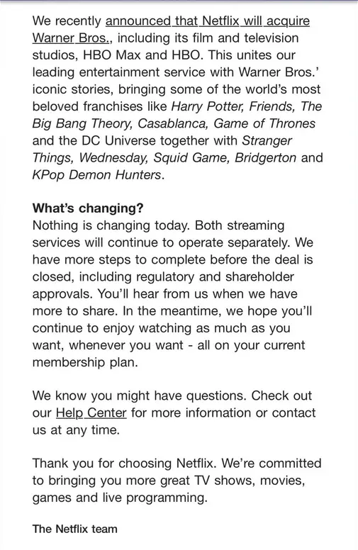 The email, sent by the “Netflix team” to over 82 million U.S. accounts, repeatedly emphasized that “nothing is changing” and that both Netflix and HBO Max will continue to operate separately until the acquisition is finalized.
