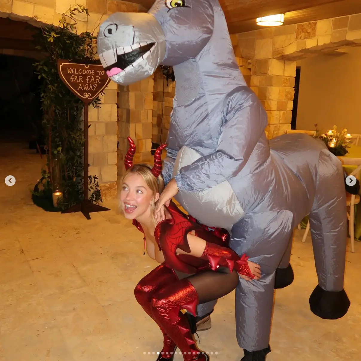 Sydney Sweeney had a playful start to the holiday season with a Shrek-themed Friendsgiving party. The Euphoria star dressed as a sexy version of the dragon from the 2001 animated film, wearing a red metallic bodysuit with a plunging neckline, matching knee-high socks, arm sleeves, and dragon ears.