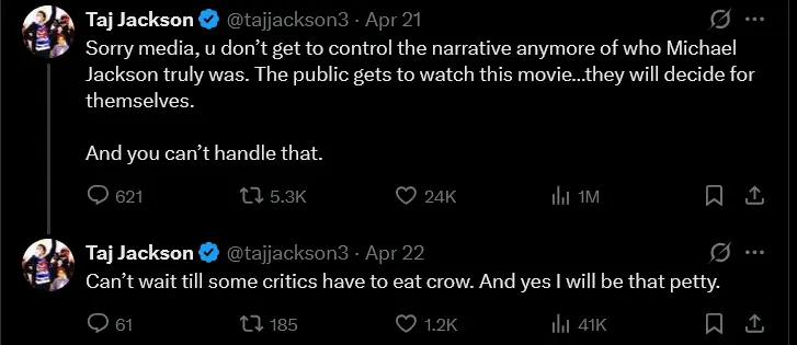 He said the public should be able to judge the film for themselves once it is released. In one of his posts, he wrote, “The media can no longer control the narrative anymore of who Michael Jackson truly was. The public gets to watch this movie… they will decide for themselves,” adding, “And you can’t handle that.”