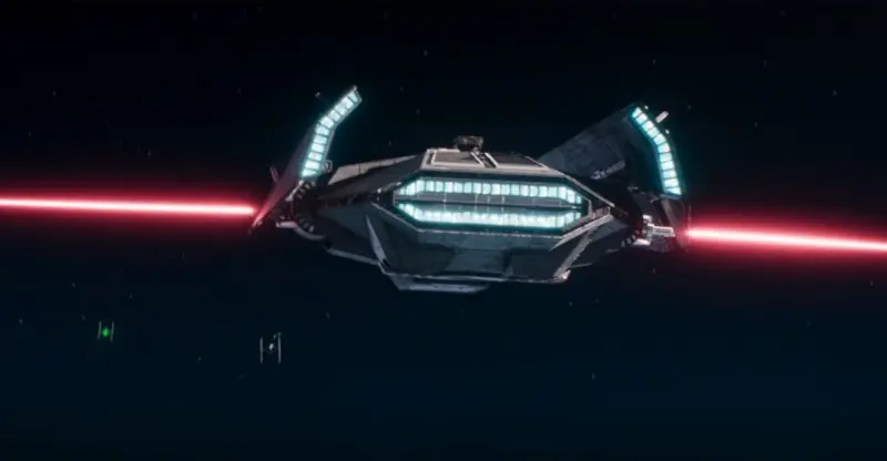 A customs stop shows the Fondor ejecting charged countermeasures that shred a tractor beam array and then firing paired energy beams that slice through TIE fighters. Civilian freighters in ‘Star Wars’ usually carry decoys or speed, not weapons that can carve Navy craft in open space.