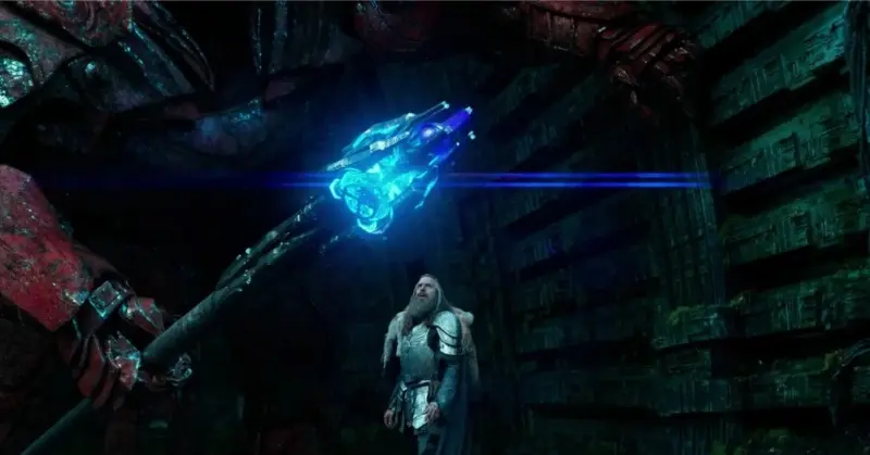 The staff is said to be alien tech, yet it acts like magic. Only Merlin’s bloodline can use it. The film never shows how that “lock” works or why it exists. It just does.
