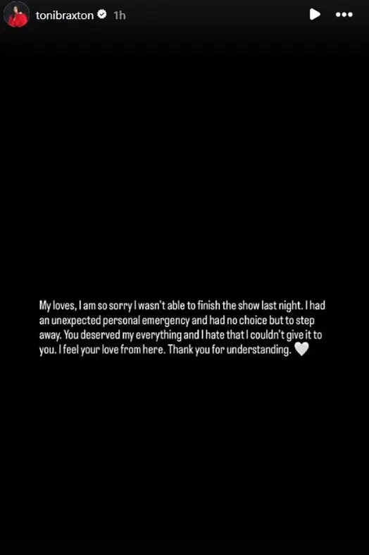 “My loves, I am so sorry I wasn’t able to finish the show last night. I had an unexpected personal emergency and had no choice but to step away,” she wrote. She added, “You deserved my everything, and I hate that I couldn’t give it to you. I feel your love from here. Thank you for understanding.”