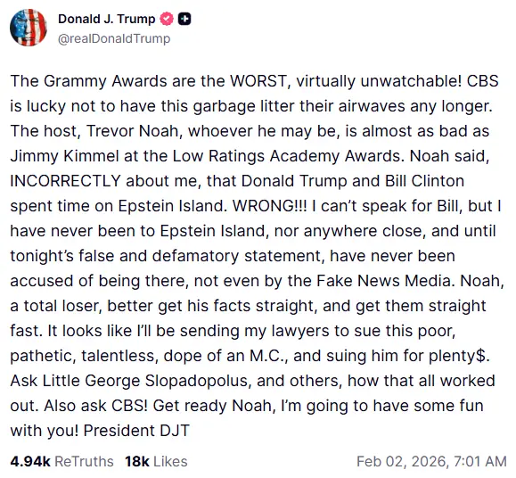 Still on stage, he reminded the crowd that this was his last year hosting the Grammys, meaning there wasn’t much anyone could do about what he said. He even joked about the president’s long history of lawsuits, saying the show was airing fully live, so no one could claim it was edited later.