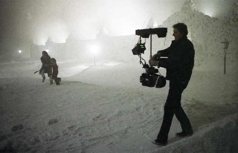 The production relied on in camera solutions for many signature images, including the elevator flood and the frozen maze. These were created with controlled rigs, set pieces, and makeup rather than digital tools, so the textures and lighting match the surrounding environment in every frame.