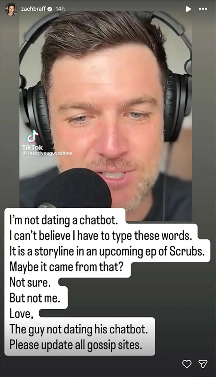 In his Instagram Stories, Braff wrote, “I’m not dating a chatbot. I can’t believe I have to type these words. It is a storyline in an upcoming ep of Scrubs. Maybe it came from that? Not sure. But not me. Love, The guy not dating his chatbot. Please update all gossip sites.” He also shared screenshots from the podcast episode to show the origin of the rumor.